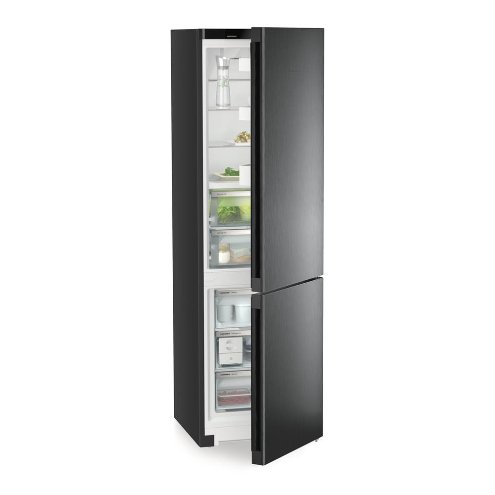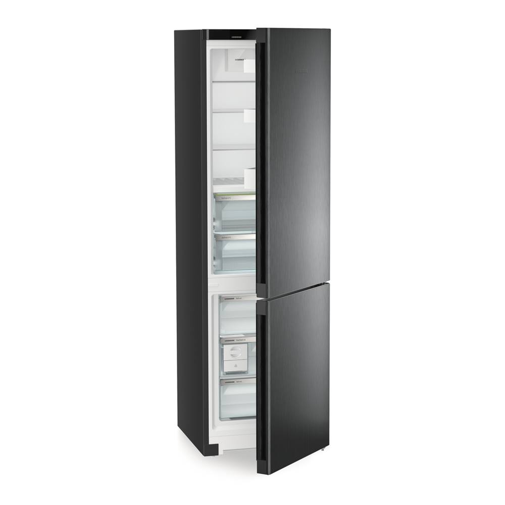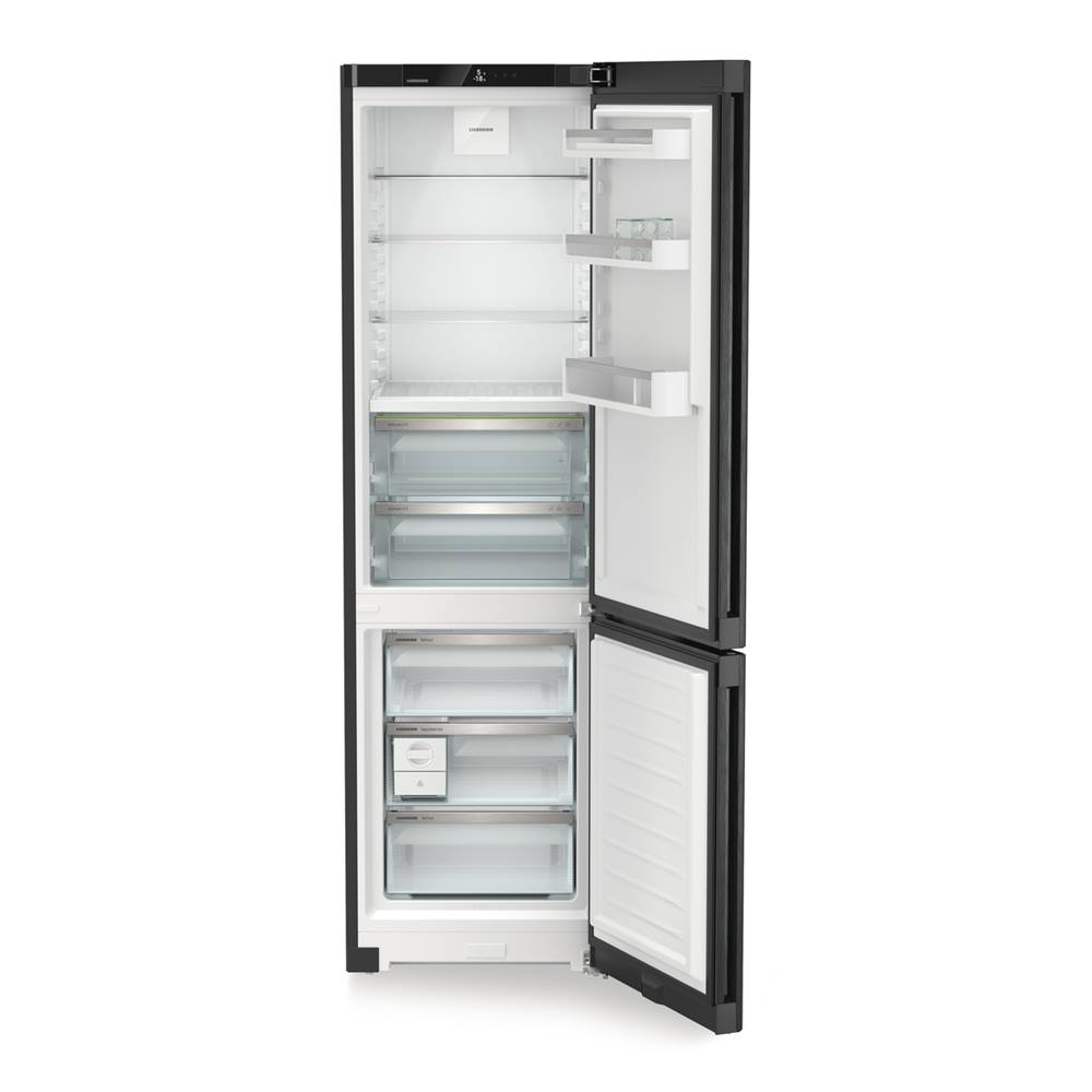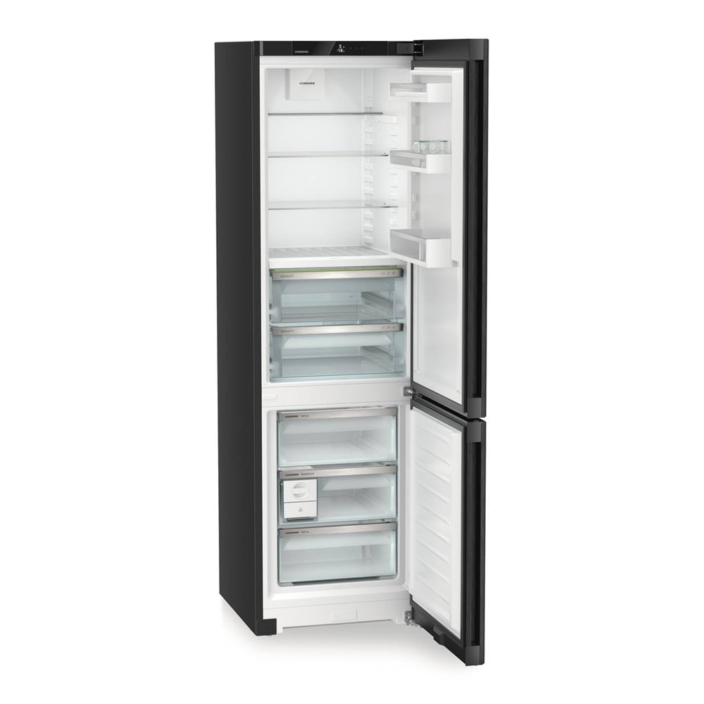 Schwarzer Kühl- und Gefrierschrank, Tür geöffnet, Innenraum mit Einlegeböden und Schubladen sichtbar.